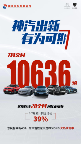 8月伊始,各大汽车厂家的销量数据陆续披露。近期,神龙汽车官方公布最新销量数据,7月份,神龙汽车交付10636辆,实现连续20个月的同比正增长。同时,1-7月累计销量66395辆,累计同比增长39%。此外,神龙汽车旗下备受期待的重磅明星新品——东风标致新408、东风雪铁龙天逸BEYOND也于7月份火热开启预售,吸引了市场众多关注。