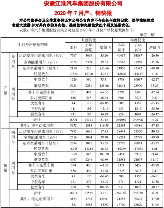 累计来看,由于上半年疫情对市场需求的冲击较大,今年1-7月,江淮汽车累计销量为24.62万辆,同比下滑6.29%。其中,乘用车板块的销量为7.95万辆,同比下滑24.3%,SUV降幅高达30.55%。