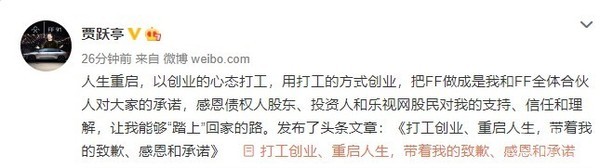 只要梦想不窒息,那就随时能重启 贾跃亭称要打工创业补偿股民