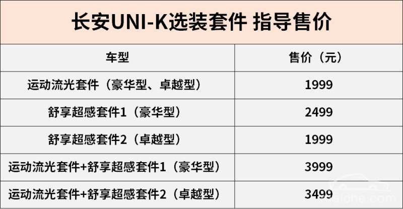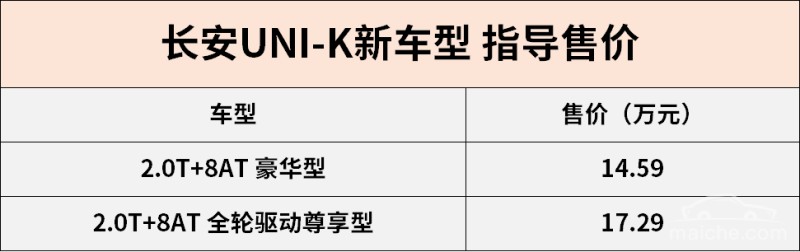 (编辑/邵帅)车友头条获悉,长安UNI-K新车型正式上市,售价为14.59-17.29万元。新车延续了在售款型的设计,推出定制选装包,动力方面搭载2.0T发动机。详情如下: