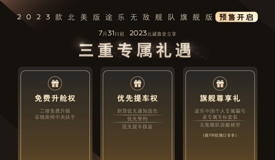 即日起至7月31日,预售期内交付2023元诚意金(随时可退),将享受“免费升舱、优先提车、旗舰尊享”等专属福利。
